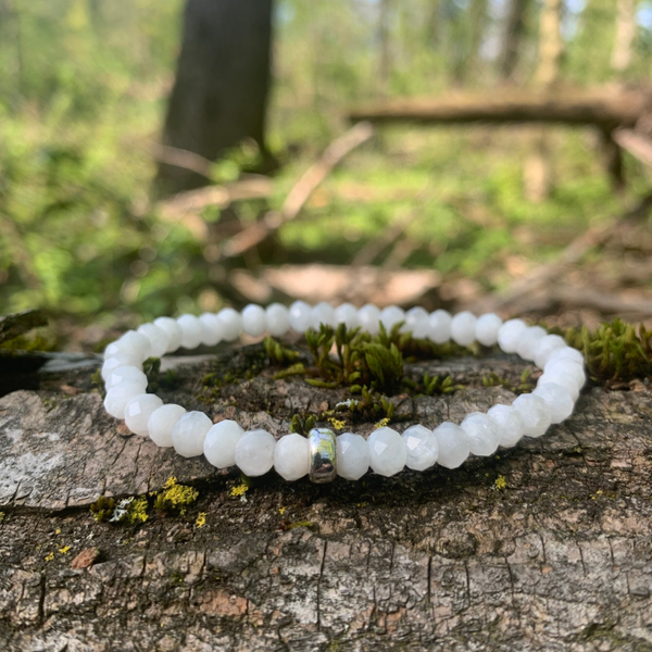 Funkelndes Edelstein Armband aus facettierten Regenbogen Mondstein Rondellen, veredelt mit einem feinen 925 Sterling Silber Rondell.