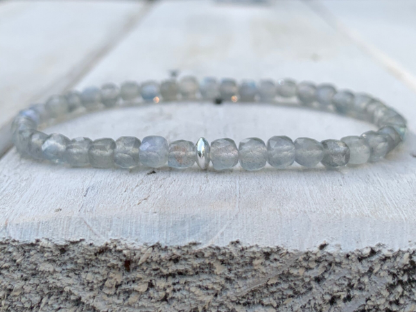 Im minimalistischen HIMMELSGLANZ Labradorit Edelstein Armband sind filigrane, facettierte Labradorit Würfel, veredelt mit einem feinen 925 Sterling Silber Rondell, zu einem funkelnden Lieblingsschmuckstück verarbeitet. Die klitzekleinen ca. 4 mm Würfelchen funkeln herrlich durch die Facetten und weisen tolle Lichtreflexionen auf. Die wunderschöne Natürlichkeit spricht für sich.