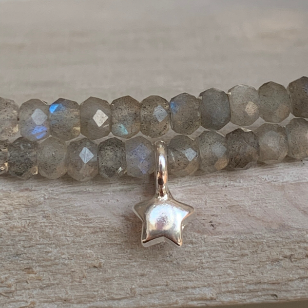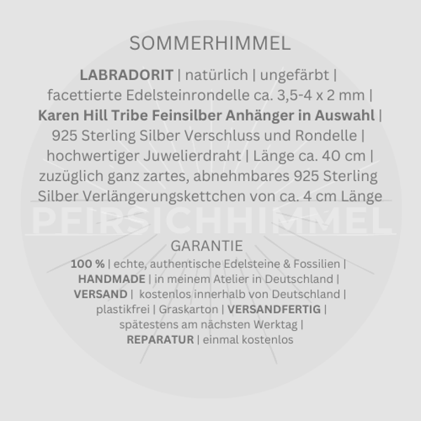 In der filigranen SOMMERHIMMEL Labradorit Edelstein Choker Halskette sind leuchtende Labradorit Rondelle zu einem zart funkelnden Lieblingsschmuckstück verarbeitet. Dieser minimalistische Choker ist mit einem zauberhaften, handgearbeiteten Karen Hill Tribe Feinsilber Anhänger im edlen Bohostyle veredelt. Zur Auswahl stehen 6 verschiedene, massive Anhänger. Dieser sitzt fest in der Mitte der Kette zwischen den feinen Rondellen und bleibt daher immer schön an seinem vorgesehenen Platz.