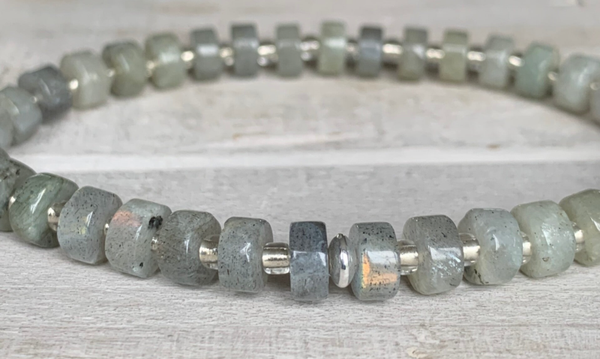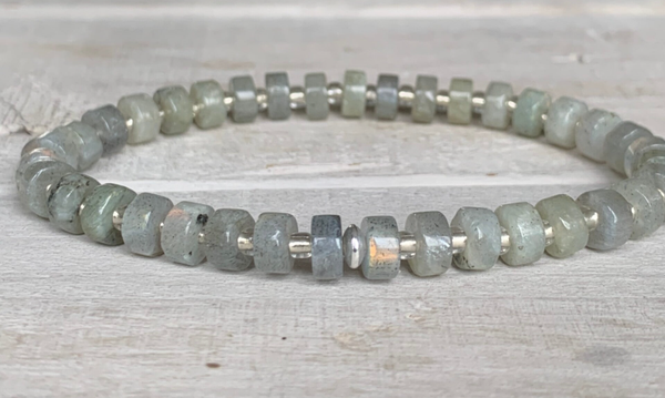 Im filigranen FLUSSAUE Labradorit Armband im edlen Bohostyle sind glatte Edelstein Heishi Rondelle im Wechsel mit kleinen Glasperlen, veredelt mit einem feinen 925 Sterling Silber Rondell, zu einem zeitlosen Perlenarmband verarbeitet.