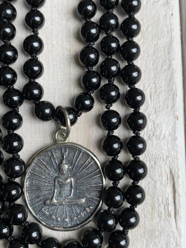 In der samtschwarzen NACHTAKTIV Edelstein Mala Kette spiegelt sich auf feinen Onyx Edelsteinen edel das Licht. Die handgeknüpfte Edelsteinkette im edlen Bohostyle verzaubert ganz schlicht und eindrucksvoll.