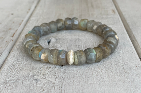 Im funkelnden Labradorit Edelstein Armband LEUCHTFEUER sind ca. 8-8,5 x 5-6 mm große, facettierte Labradoritrondelle (Freiform), veredelt mit einem fein strukturieten 925 Sterling Silber Rondell, zu einem beeindruckenden Lieblingsschmuckstück verarbeitet. Dieses Perlenarmband im edlen Bohostyle, funkelt herrlich durch die leuchtenden Facetten und weist wunderschöne Lichtreflexionen auf. Der Labradorit wirkt in dieser Kombination sehr lebhaft, weist neben grauen Nuancen auch braune Einschlüsse auf und erscheint durch seine intensive Lichtbrechung unglaublich geheimnisvoll.