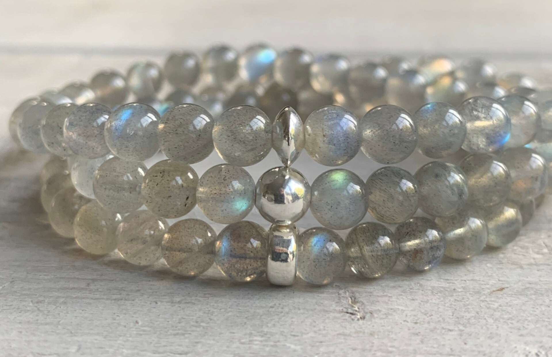 Das auffallendste Merkmal eines Labradorits ist das irisierende Farbspiel und der blaue Schimmer. Aus einem - auf den ersten Blick - unscheinbar wirkenden Edelstein wird bei einem bestimmten Lichteinfall ein zauberhaft magisches Schmuckstück. So auch hier bei diesen besonders schönen Rondellen. Häufig schlicht hellgrau, blitzt urplötzlich die blaue Lichtreflexion der Labradoreszenz auf.