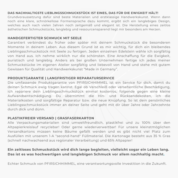 Garantiert verbindest du früher oder später mit deinem Schmuckstück Erlebnisse und Emotionen, daher soll es dich ein Leben lang begleiten. Jeden einzelnen Edelstein wählen wir sorgfältig von Hand aus. Wir nehmen wirklich nur die schönsten. Eine Anschaffung für die Ewigkeit, puristisch, nachhaltig und mit Reparaturservice.
