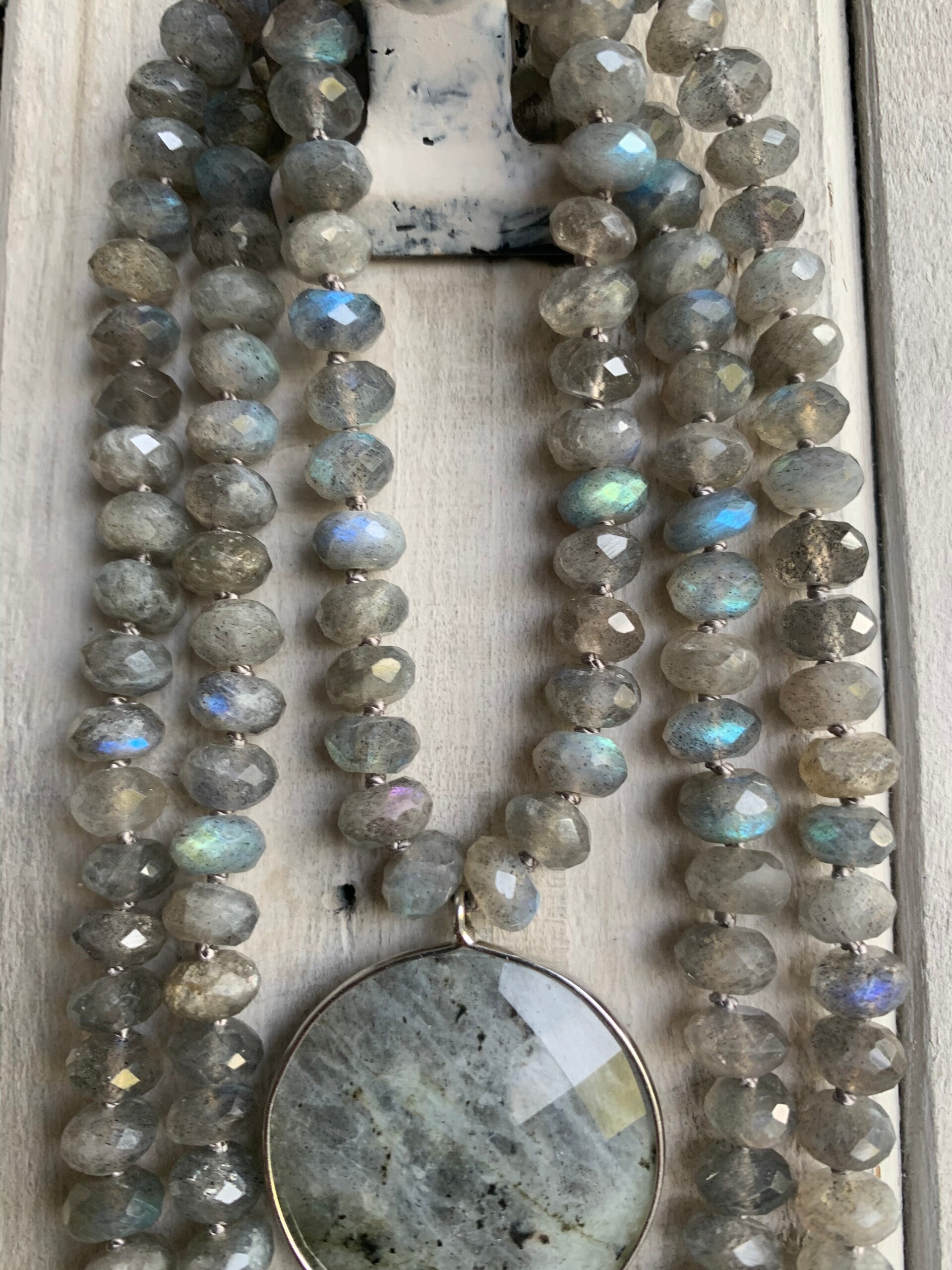 Die filigrane, lange Mala Perlenkette ist mit einem ebenfalls facettierten Labradorit Anhänger aufgewertet und zieht alle Blicke auf sich, sobald ihre blauen und changierenden Reflexionen aufblitzen.