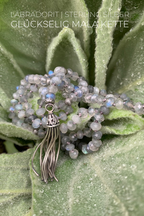 Wir verwenden eigens nur die Labradorite, die nicht allzu bunt schillern sondern edel zurückhaltende, bläuliche Reflexe aufweisen. Die GLÜCKSELIG MALA KETTE spiegelt das Licht mondän in ihren facettierten Edelsteinen und blitzt wunderschön magisch blau auf.