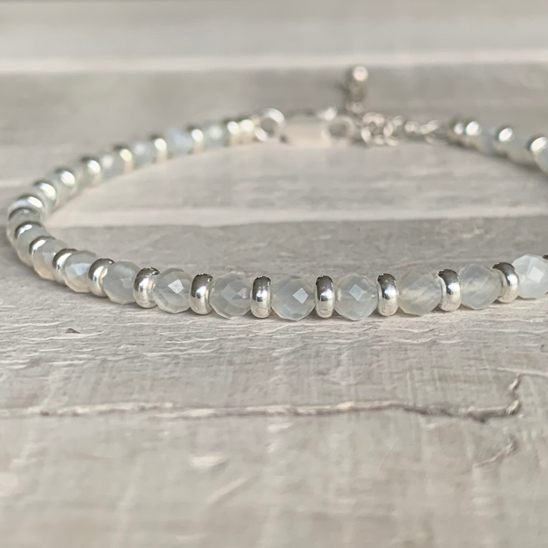Im zarten, von ca. 15 bis 20 cm verstellbaren MONDZIRKEL Edelstein Armband sind filigrane, facettierte Mondstein Perlen, im Wechselspiel mit ganz feinen 925 Sterling Silber Rondellen, zu einem funkelnden Lieblingsschmuckstück verarbeitet. Das zierliche Perlenarmband im glamourösen Boho Look, funkelt herrlich mit grazilen 4 mm Edelstein Perlen und weist tolle Lichtreflexionen auf. Die wunderschöne Natürlichkeit spricht für sich.
