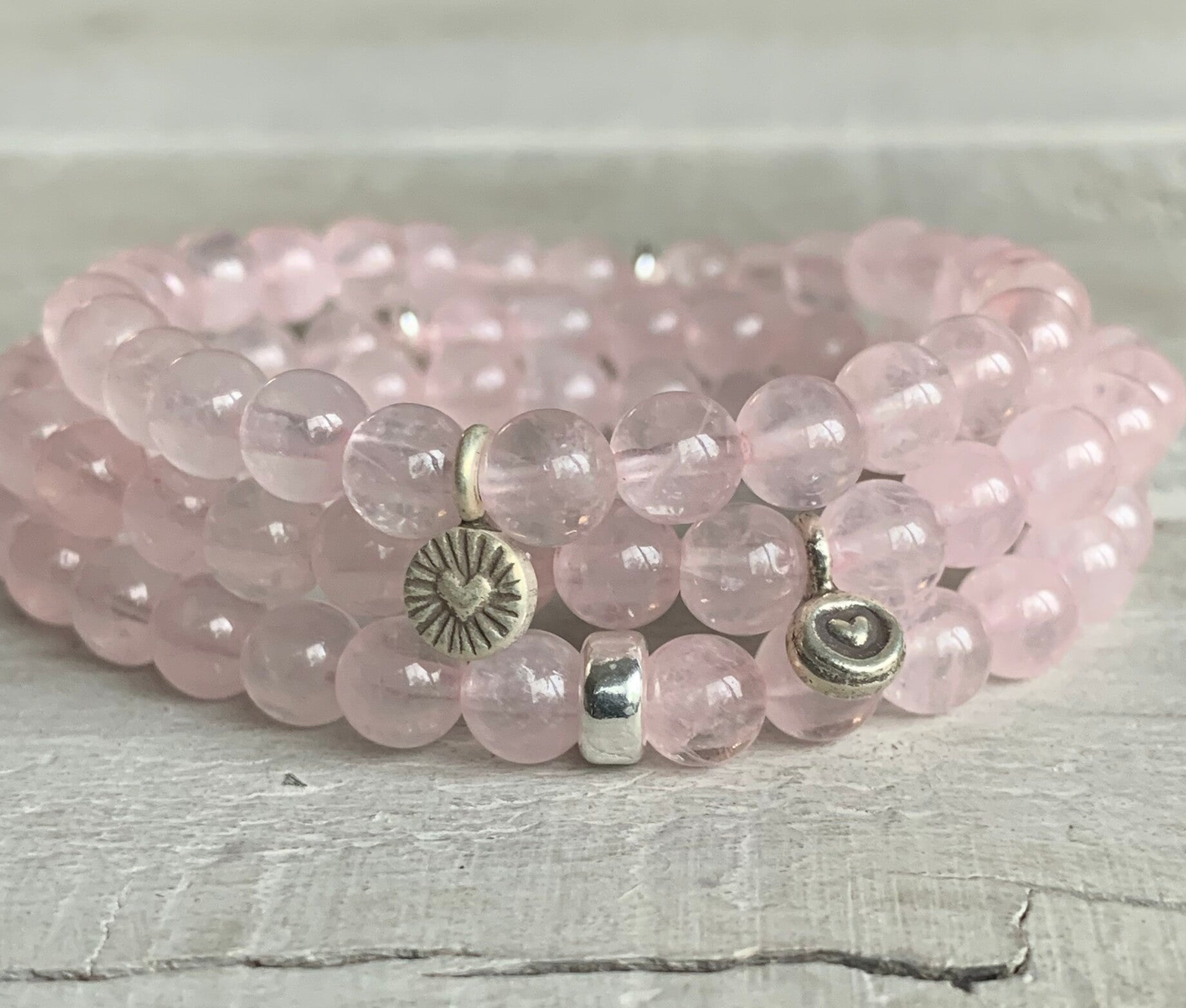 Rosenquarze können sich farblich sehr unterscheiden, denn die Farbe wird durch mikroskopische Einschlüsse anderer Mineralien verursacht. Daher gibt es farblich intensive oder auch transparente Edelsteine. In diesem schönen Armband findest du die Verarbeitung von sehr hellen bis edel durchscheinenden Rosenquarzen.