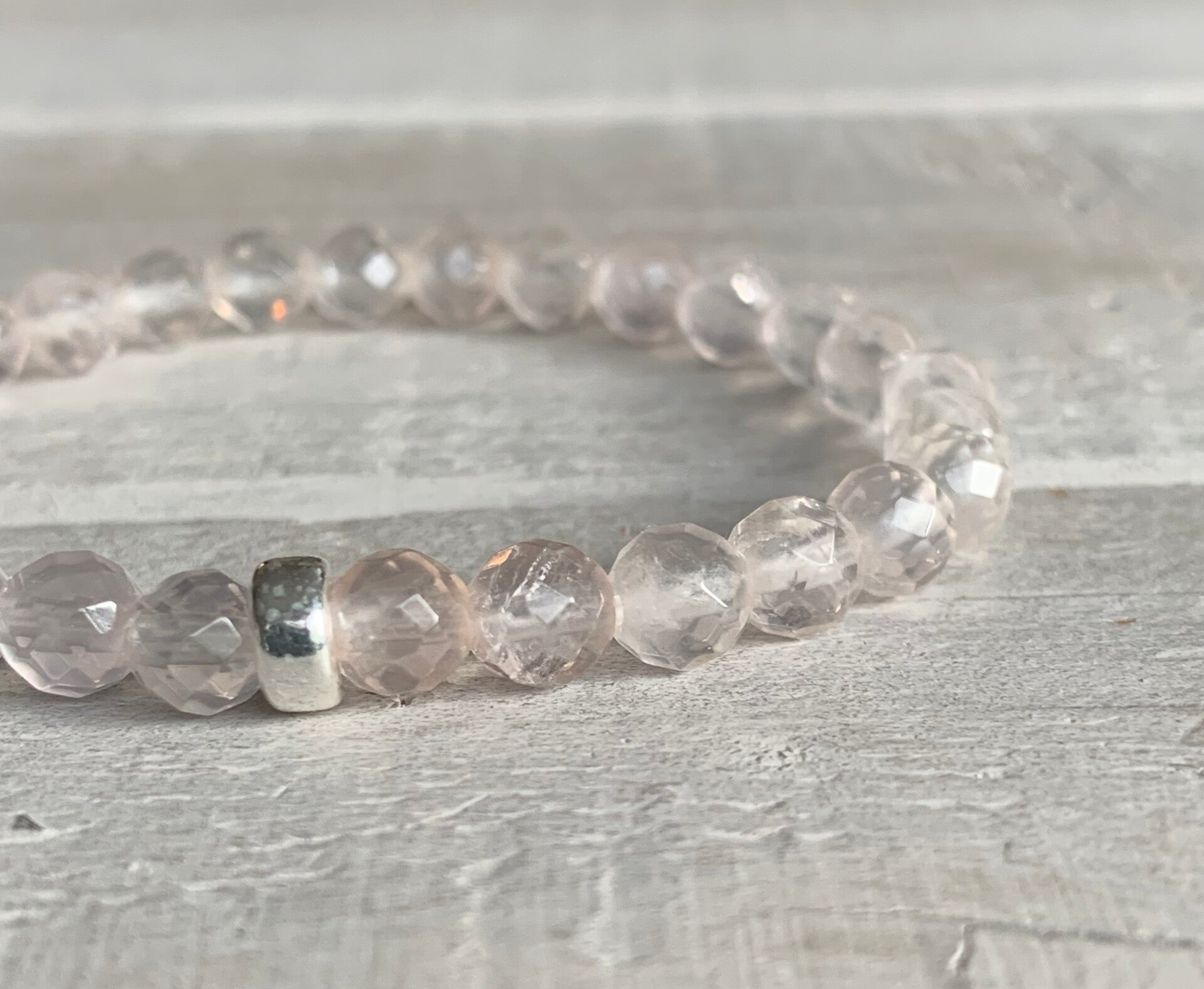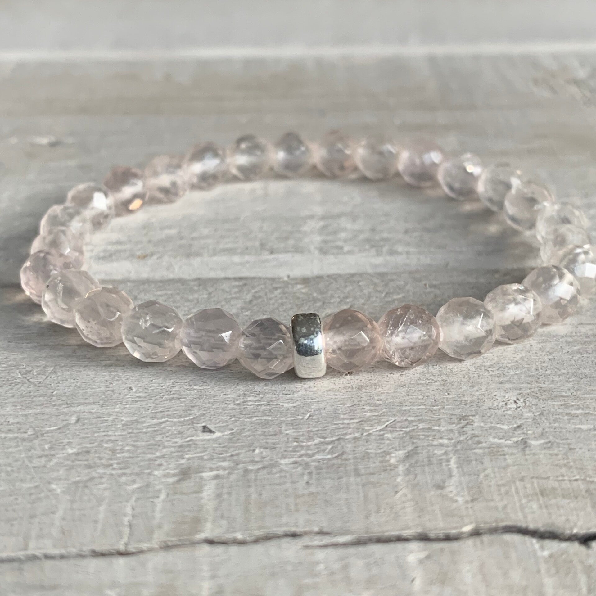 Im filigranen ROSENWOLKE Rosenquarz Edelstein Armband sind facettierte 6 mm Perlen, wahlweise veredelt mit einer schlichten 925 Sterling Silber Perle oder einem minimalistischen 925 Sterling Silber Rondell, zu einem funkelnden Mala Perlenarmband im edlen Bohostyle verarbeitet.
