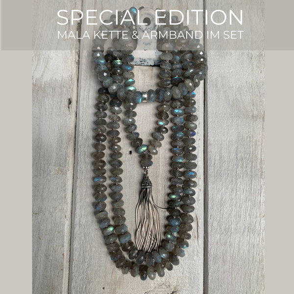 Unsere „SPECIAL EDITION“ präsentiert die filigrane, handgeknüpfte FREUDENTAUMEL LABRADORIT MALA Kette, begleitet von einem passenden Labradorit Edelsteinarmband (im Wert von 34 €), zusammen als Geschenkset zum SONDERPREIS! Das Armband ist zusätzlich mit einem 925 Sterling Silber Rondell verfeinert.