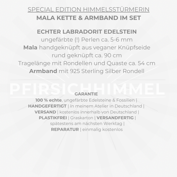 Unsere „SPECIAL EDITION“ präsentiert die filigrane, handgeknüpfte HIMMELSSTÜRMER LABRADORIT Edelstein Mala Kette, begleitet von einem passenden Labradorit Edelsteinarmband (im Wert von 34 €), zusammen als Geschenkset zum SONDERPREIS! Das Armband ist zusätzlich mit einem 925 Sterling Silber Rondell verfeinert.