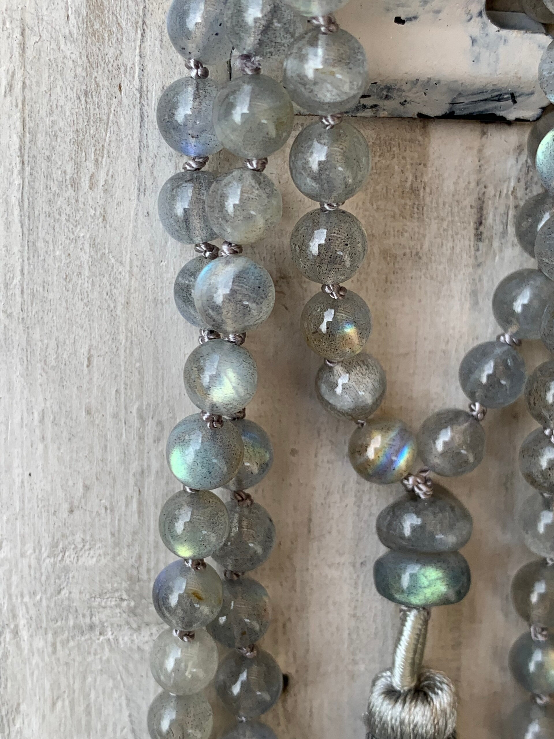 Die handgeknüpfte, lange HIMMELSSTÜRMER MALA Kette im edlen Bohostyle fasziniert mit glatt geschliffen Labradorit Edelsteinen in einer zauberhaften, außergewöhnlichen Qualität. Die filigranen Edelsteine sind hier besonders fein und weisen absolut beeindruckende Lichtspiegelungen auf.