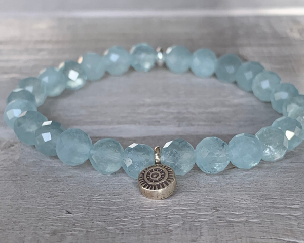 Im filigranen Aquamarin Armband WOLKENFREI SONNE sind facettierte Edelsteine, veredelt mit einem massiven, kleinen Karen Hill Tribe Feinsilber Anhänger sowie einem feinen Sterling Silber Rondell, zu einem funkelnden Mala Perlenarmband im edlen Bohostyle verarbeitet. Der charaktervolle Feinsilber Anhänger zeigt auf der Vorderseite (Rückseite glatt) eine zauberhaft stilisierte Sonne. Ein wirklich reizendes Motiv für alle SonnenliebhaberInnen.