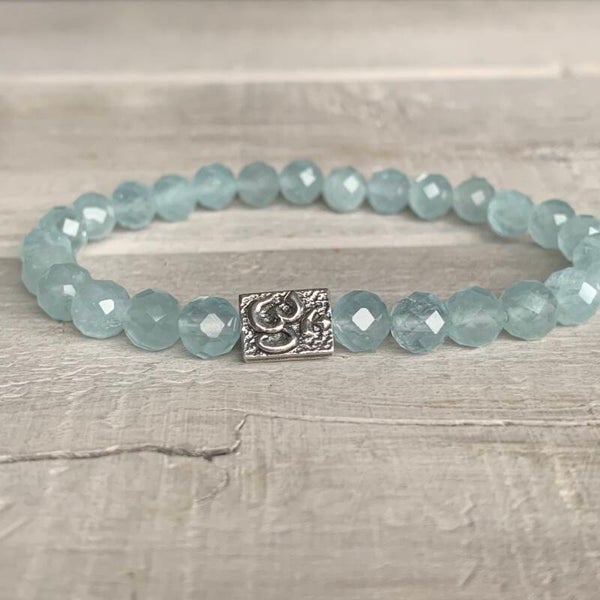 Im funkelnden Aquamarin Edelstein Armband WOLKENFREI OM sind zauberhaft facettierte Edelsteinperlen, veredelt mit einem außergewöhnlichen 925 Sterling Silber Element, zu einem filigranen Mala Perlenarmband im edlen Bohostyle verarbeitet. Besonderer Blickfang ist hier die detailliert gearbeitete, buddhistische Perle mit dem OM-Symbol aus 925 Sterling Silber.