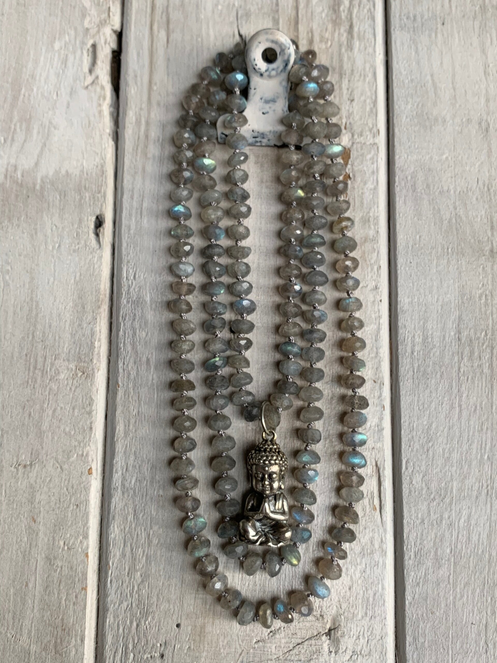 LABRADORIT Mala Edelstein Kette | handgeknüpft | MEERESBRAUSEN BUDDHA
