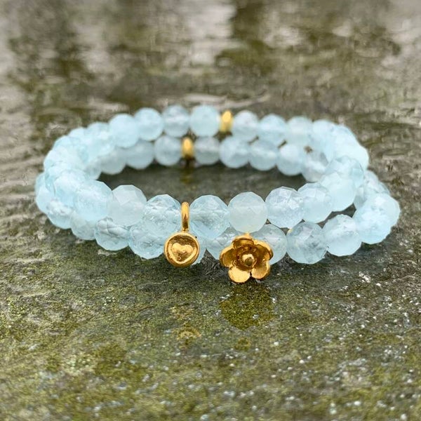 Im filigranen Aquamarin WOLKENFREI sind atemberaubende Edelsteine, veredelt mit einem zauberhaft kleinen Karen Hill Tribe 10 Karat Gold-Vermeil Anhänger auf Grundlage eines Feinsilber Anhängers sowie einem feinen 18K vergoldeten Rondell, zu einem funkelnden Mala Perlenarmband im edlen Bohostyle verarbeitet.