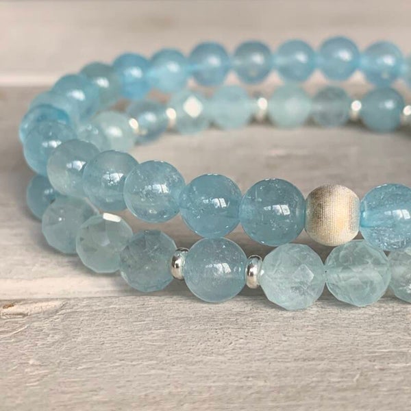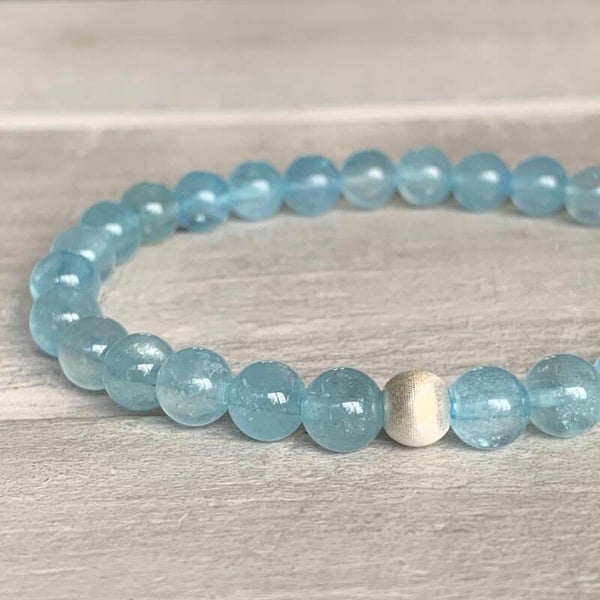 Im kostbaren Aquamarin Edelstein Armband HIMMELMEER sind zarte 6 mm Edelsteinperlen, veredelt mit einer filigranen 925 Sterling Silber Perle, zu einem edlen Perlenarmband im minimalistischen Bohostyle verarbeitet. Die Aquamarine in diesem Edelsteinarmband haben eine herausragende Qualität mit hoher Transparenz und wirken dadurch sehr mondän!