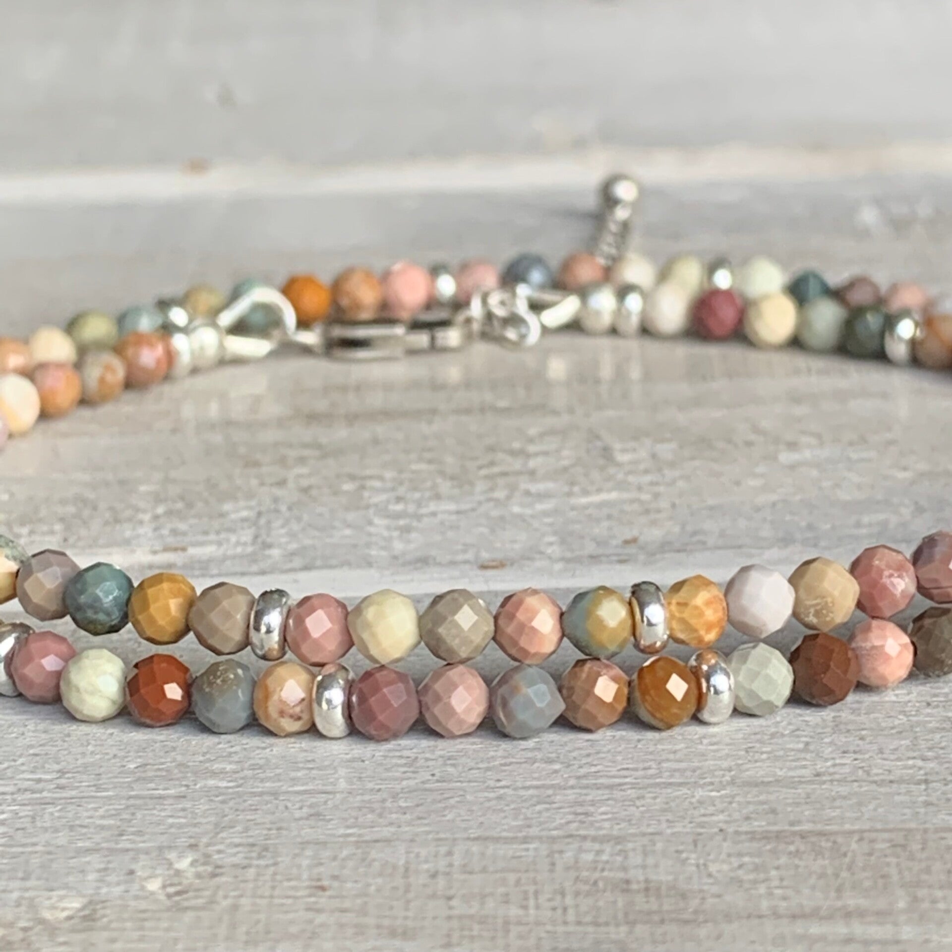 Im zarten SCHÖNGEIST Edelstein Armband sind echte ca. 3 mm Achat Edelsteinperlen, veredelt mit zarten 925 Sterling Silber Rondellen, zu einem feinen Lieblingsschmuckstück verarbeitet. Dieses handgefertigte Perlenarmband, im edlen Bohostyle, schmeichelt mit funkelnden Achat Edelsteinen im Facettschliff in einer wunderschönen natürlichen Farbigkeit. Die winzigen Edelsteinchen sind wie immer in natura noch viel schöner!