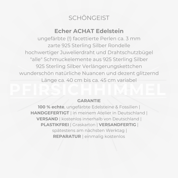 In der zarten SCHÖNGEIST Achat Edelstein Choker Halskette (halsnahe Form) sind echte ca. 3 mm Achatperlen, veredelt mit feinen 925 Sterling Silber Rondellen, zu einem zauberhaften Lieblingsschmuckstück verarbeitet.