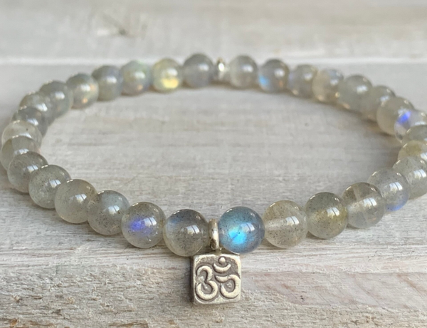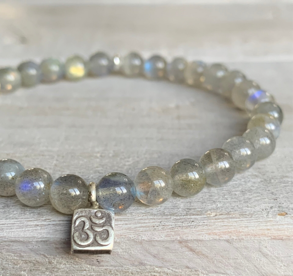 Das zarte Labradorit Edelstein Armband HIMMELSSTÜRMERIN OM beeindruckt mit filigranen 6 mm Labradoritperlen, veredelt mit einem handgearbeiteten Karen Hill Tribe Feinsilber Anhänger im edlen Bohostyle.