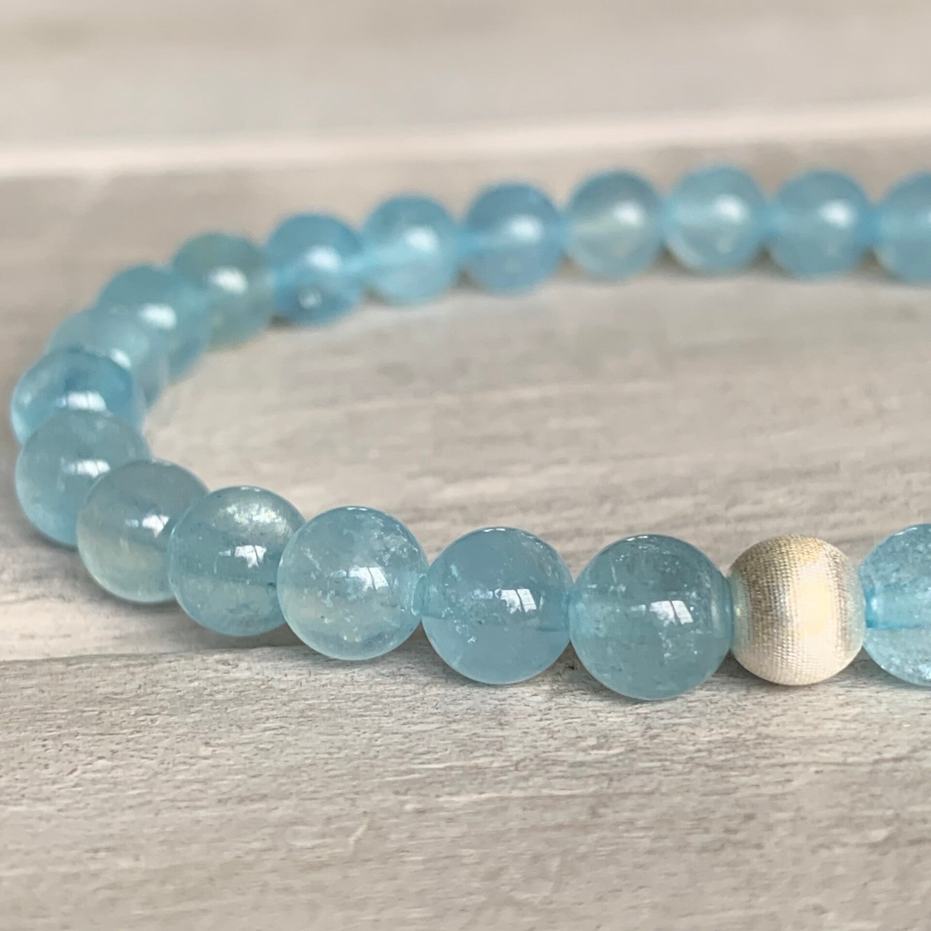 Im kostbaren Aquamarin Armband HIMMELMEER sind zarte 6 mm Edelsteine, veredelt mit einer filigranen 925 Sterling Silber Perle, zu einem edlen Perlenarmband im minimalistischen Bohostyle verarbeitet. Die Aquamarine in diesem Edelsteinarmband haben eine herausragende Qualität mit hoher Transparenz und wirken dadurch sehr mondän!