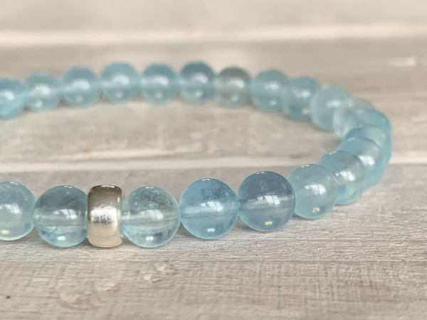 Im kostbaren Aquamarin Armband HIMMELMEER sind zarte 6 mm Edelsteine, veredelt mit einem filigranen 925 Sterling Silber Element, zu einem edlen Perlenarmband im minimalistischen Bohostyle verarbeitet. Die Aquamarine in diesem Edelsteinarmband haben eine herausragende Qualität mit hoher Transparenz und wirken dadurch sehr mondän!