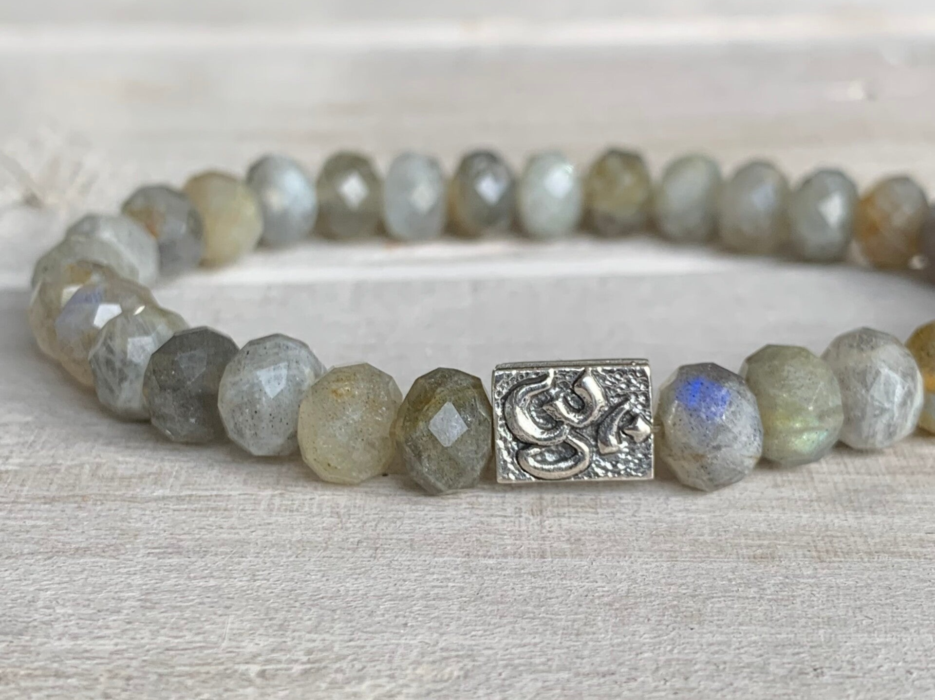 Im kraftvollen Labradorit Armband SEELENFRIEDEN sind facettierte Labradorit Rondelle (Freiform), veredelt mit einer zauberhaften 925 Sterling Silber OM Perle, zu einem elegant funkelnden Lieblingsschmuckstück verarbeitet. Der Labradorit wirkt durch die interessante Farbigkeit von verschiedenen Grau-/Khakinuancen sehr mondän und durch seine intensive Lichtbrechung unglaublich geheimnisvoll.