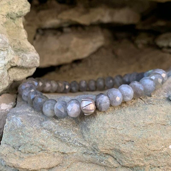 Der Labradorit wirkt durch die interessante Farbigkeit von verschiedenen Grau-/Khakinuancen sehr mondän und durch seine intensive Lichtbrechung unglaublich geheimnisvoll.