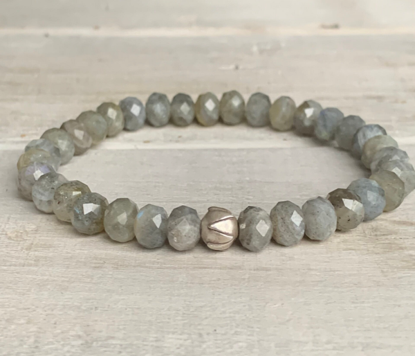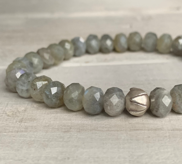 Im kraftvollen Labradorit Armband BLUMENTAU sind facettierte Labradorit Rondelle (Freiform), veredelt mit einer minimalistischen Karen Hill Tribe Feinsilber Lotusperle, zu einem elegant funkelnden Lieblingsschmuckstück verarbeitet.
