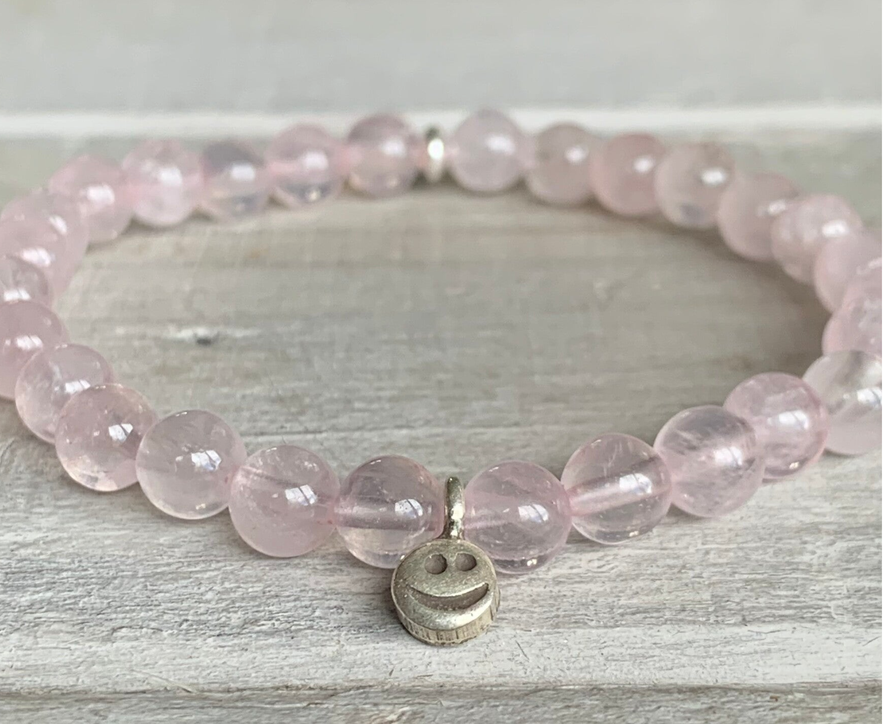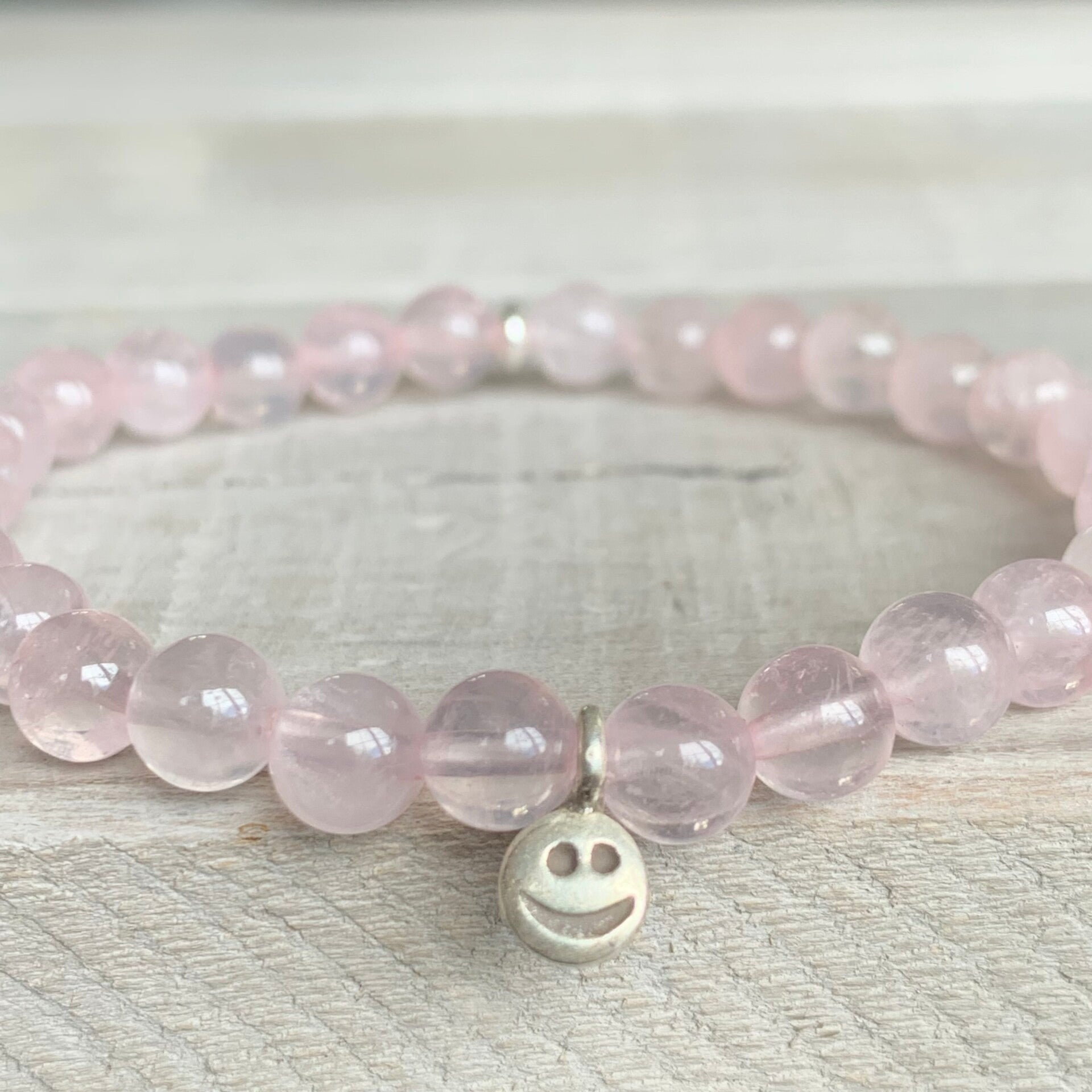 Im atemberaubenden Rosenquarz Armband APFELBLÜTENROSA sind filigrane 6 mm Edelsteinperlen, veredelt mit einem zauberhaften massiven Karen Hill Tribe Feinsilber Smile Anhänger sowie einem feinen 925 Sterling Silber Rondell, zu einem funkelnden Boho Lieblingsschmuckstück verarbeitet.