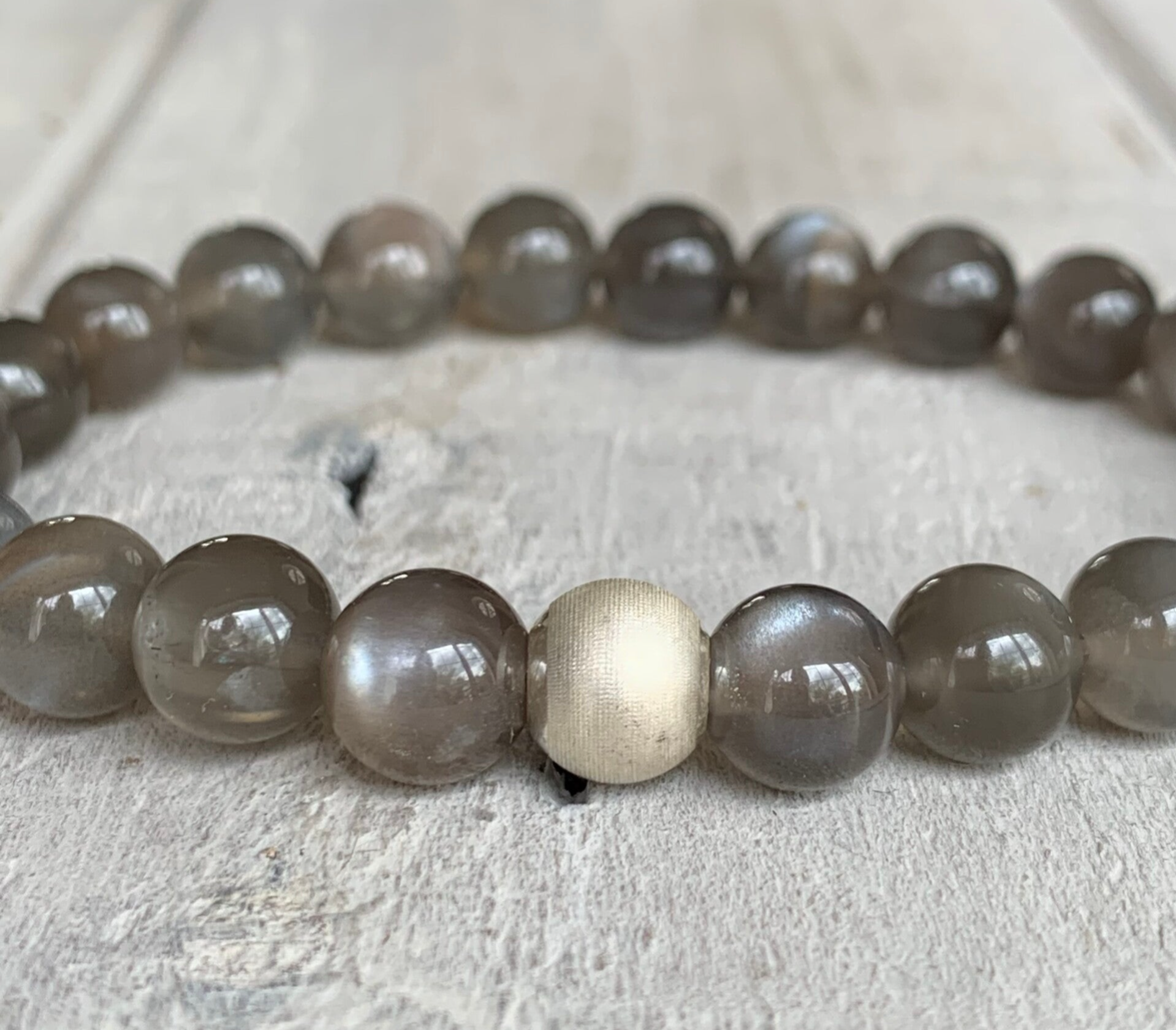 Im schwarzen Mondstein Edelstein Armband MONDNACHT sind kraftvolle 8 mm Edelsteinperlen, veredelt mit einer fein strukturierten 925 Sterling Silber Perle, zu einem stilvollen Perlenarmband im schlichten Bohostyle verarbeitet. Die dezente Farbigkeit dieser exklusiven Mondsteine ist außergewöhnlich edel und leuchtet in diesem charmanten Schmuckstück in verschiedenen schmeichelhaften Grau-/Anthrazitnuancen mit leicht taupefarbenem Unterton.