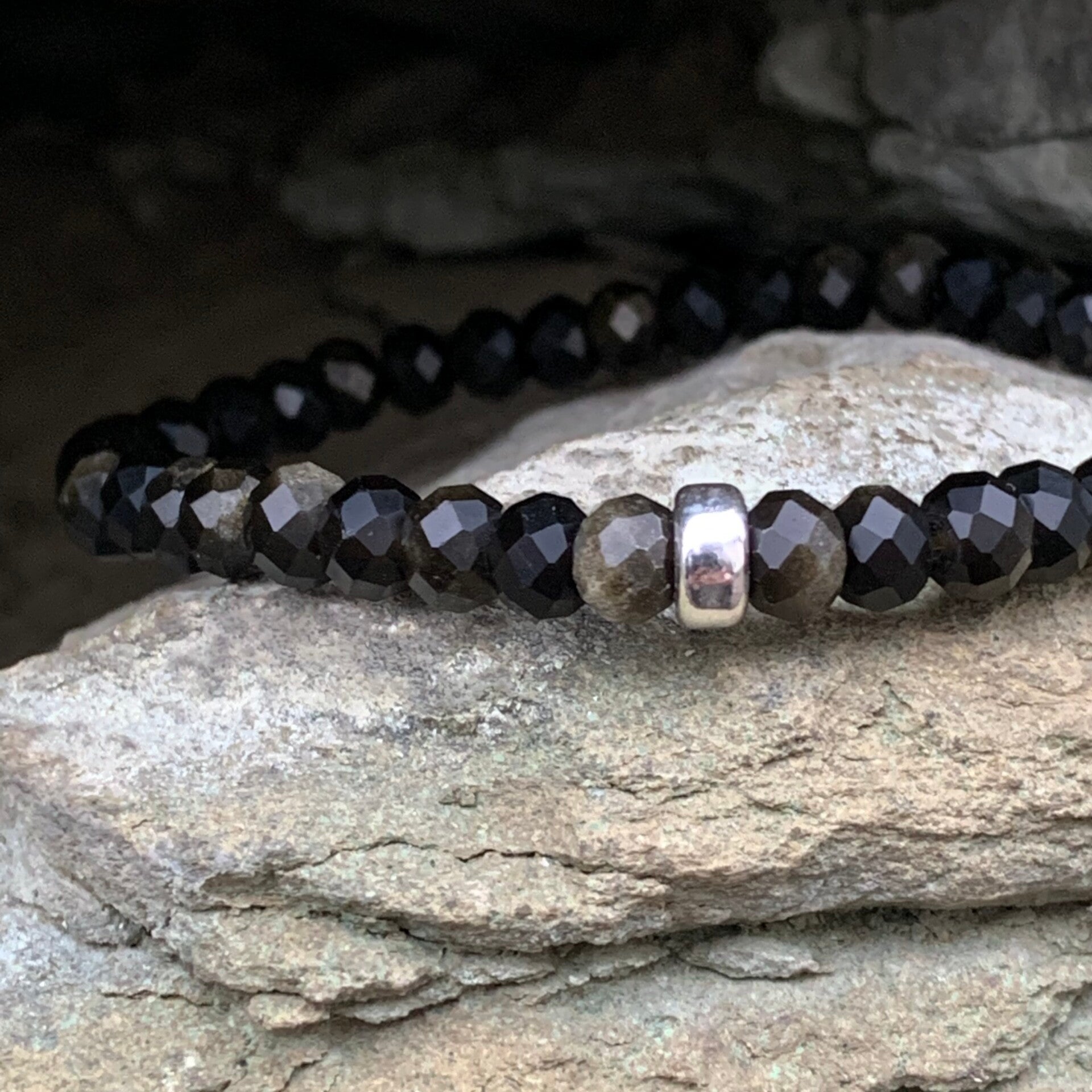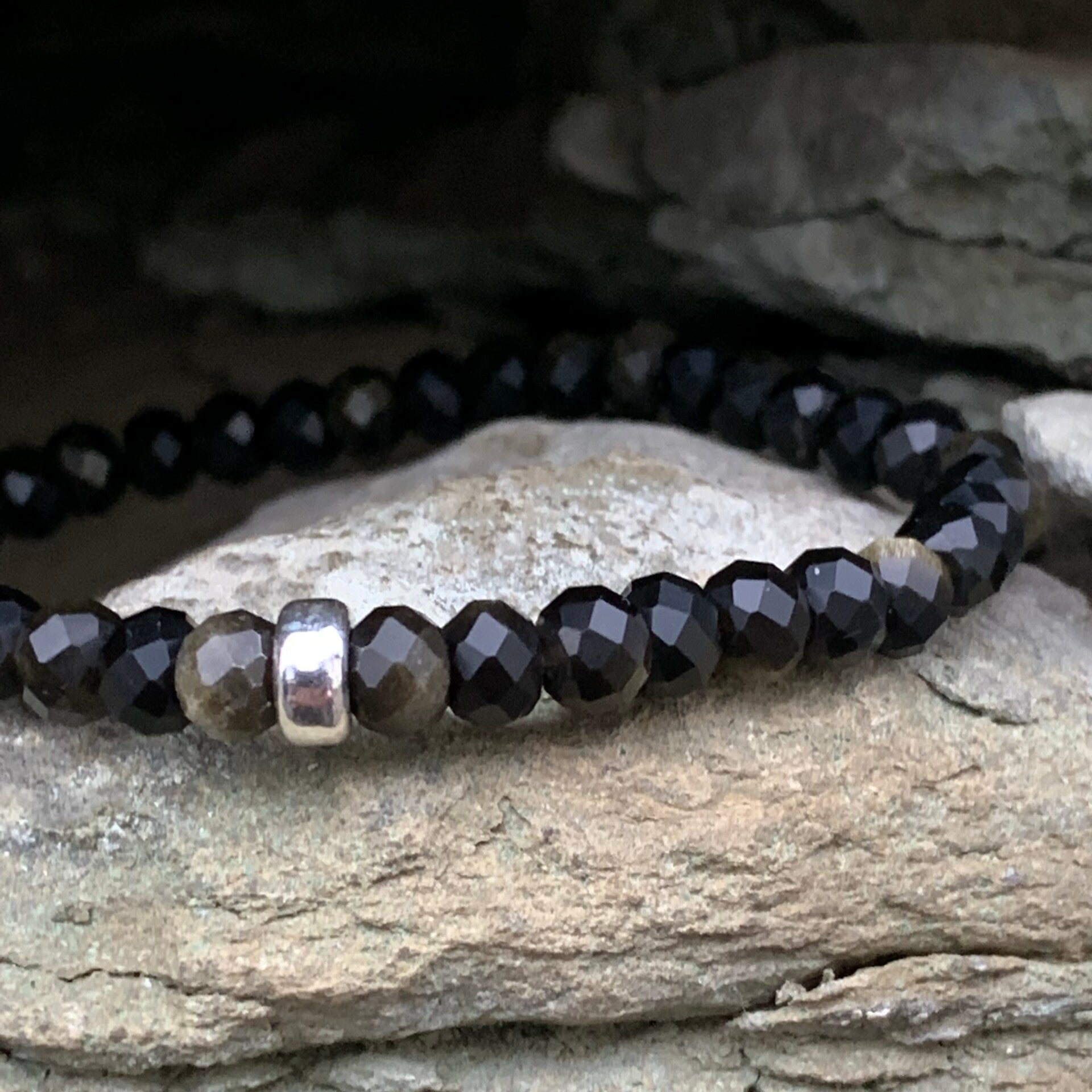 Das elegante Goldglanz Obsidian Armband NACHTSTERN beeindruckt mit filigranen, facettierten Edelstein Rondellen in einem tiefen Schwarz, mit edlem goldenen bis sandfarbenen Schimmer. Der Facettenschliff - der auch als Feuer im Stein bezeichnet wird - zaubert hinreißende Lichtreflexe in dieses feine und filigrane Edelstein Armband.
