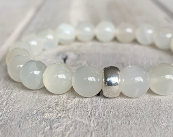 Im eleganten Mondstein Armband NEUMOND sind kraftvolle 8 mm Edelsteinperlen, veredelt mit einem minimalistischen 925 Sterling Silber Rondell, zu einem stilvollen Perlenarmband im schlichten Bohostyle verarbeitet.