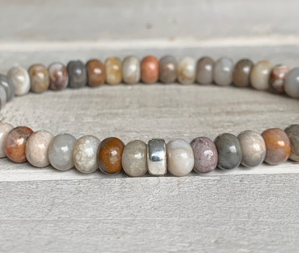 Das echte Edelsteinarmband im edlen Bohostyle verzaubert mit charmanten 6 mm Achat Rondellen. Die filigranen Edelsteine präsentieren sich in harmonischen Naturfarben in verschiedenen Beige-/Braun- und Graunuancen und steht allen Menschen! Die Rondelle erinnern an einen Strandspaziergang am Meer mit Blick über den Sand und auf die verschiedenfarbigen Muscheln.