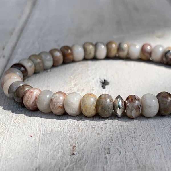 Das echte Edelsteinarmband im edlen Bohostyle verzaubert mit charmanten 6 mm Achat Rondellen. Die filigranen Edelsteine präsentieren sich in harmonischen Naturfarben in verschiedenen Beige-/Braun- und Graunuancen und steht allen Menschen! Die Rondelle erinnern an einen Strandspaziergang am Meer mit Blick über den Sand und auf die verschiedenfarbigen Muscheln.