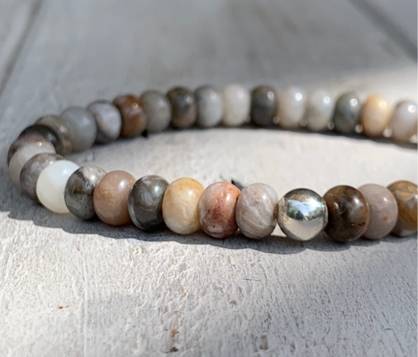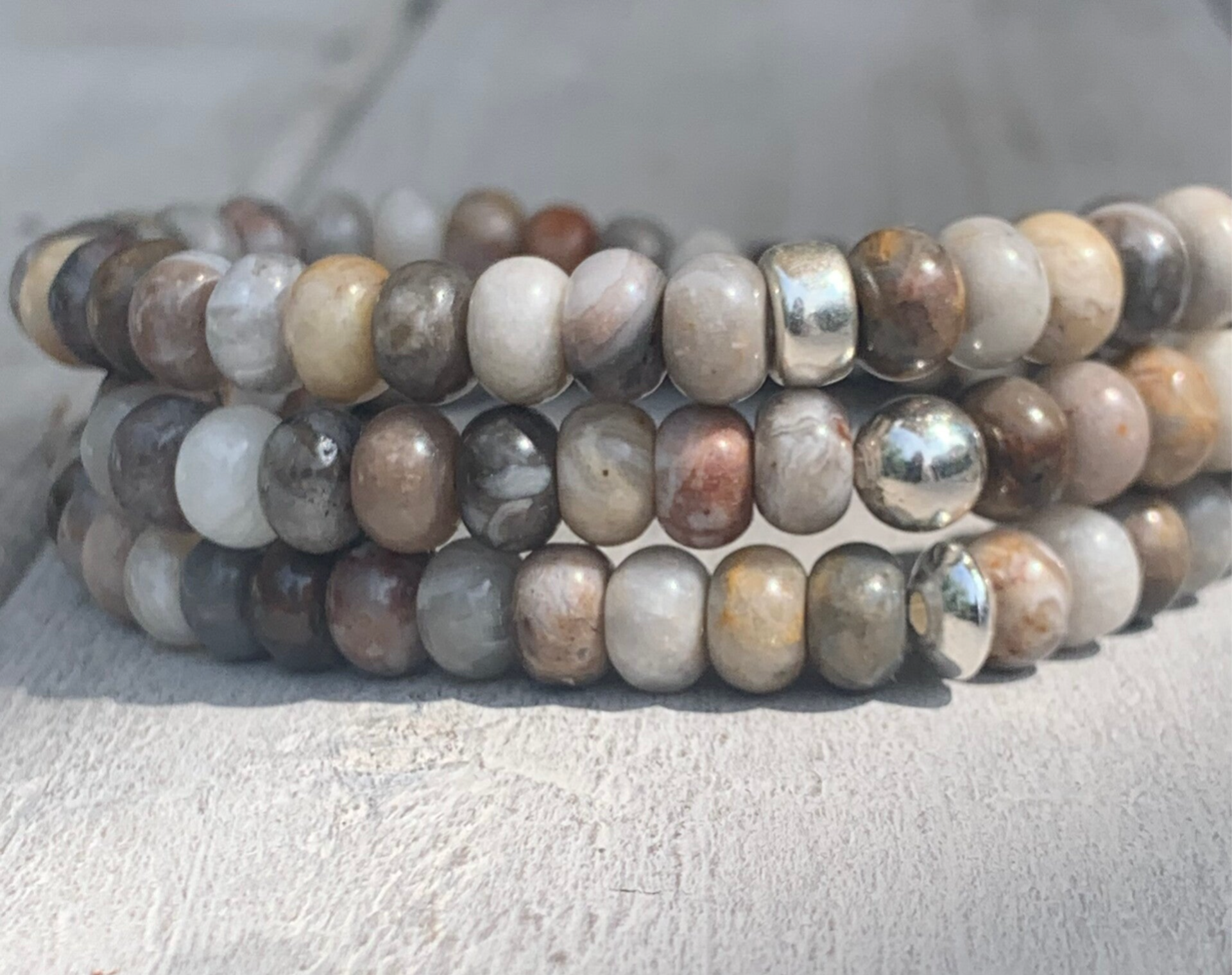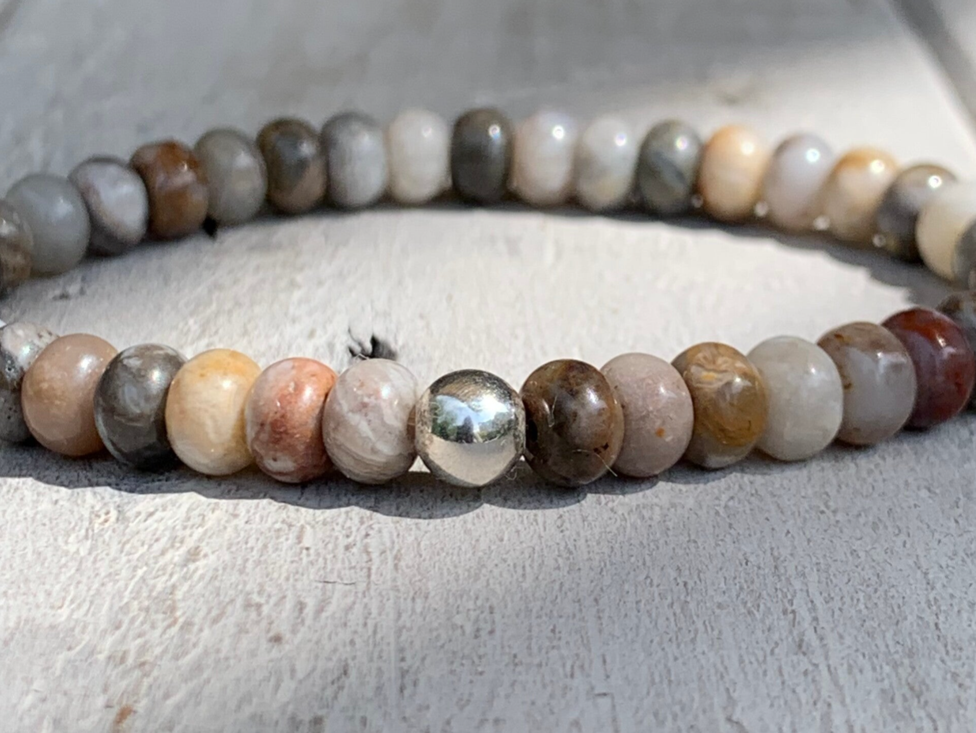 Das echte Edelsteinarmband im edlen Bohostyle verzaubert mit charmanten 6 mm Achat Rondellen. Die filigranen Edelsteine präsentieren sich in harmonischen Naturfarben in verschiedenen Beige-/Braun- und Graunuancen und steht allen Menschen! Die Rondelle erinnern an einen Strandspaziergang am Meer mit Blick über den Sand und auf die verschiedenfarbigen Muscheln.