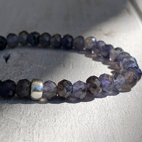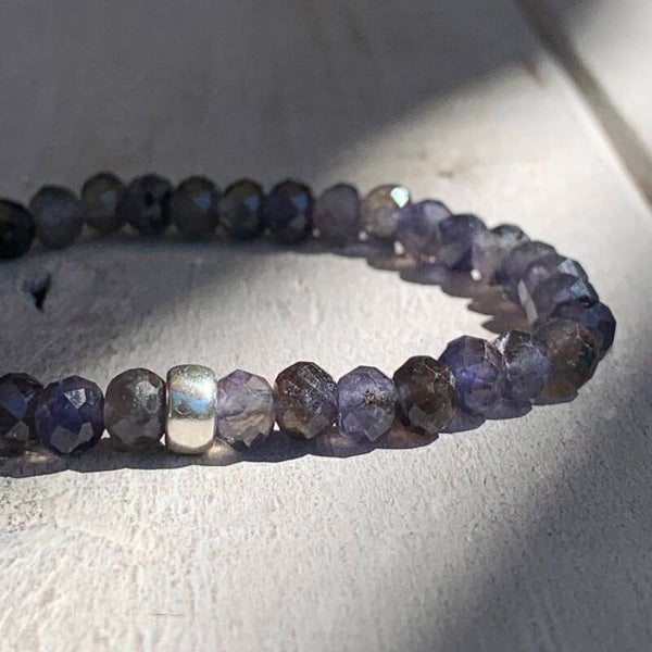 Das elegante Iolith Edelstein Armband NEBELHAUCHVIOLETT beeindruckt mit blau-, grau- bis violettfarbenen Nuancen und glitzert und funkelt zauberhaft im Licht. Dieses feine Perlenarmband im edlen Bohostyle wird durch ein minimalistisches 925 Sterling Silber Rondell aufgewertet.