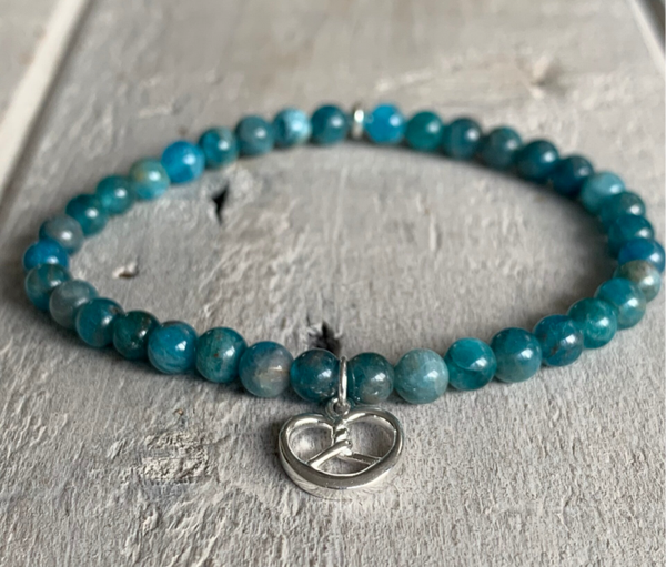Im kraftvollen Apatit Armband BREZELLIEBE sind ca. 4 mm zarte Edelsteinperlen oder ca. 5 mm feine Edelsteinrondelle, veredelt mit einem 925 Sterling Silber Rondell und einem zauberhaften 925 Sterling Silber Anhänger in Brezelform, zu einem Perlenarmband im edlen Bohostyle verarbeitet.