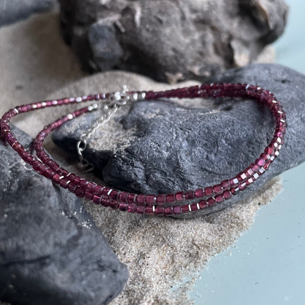 Feinste ca. 2 mm - winzig - zarte Granatperlen in Würfelform - in einer außergewöhnlich edlen Qualität - schmiegen sich sanft um deinen Hals. Die facettierten Edelsteine funkeln mit einer betörenden Intensität, die an sonnenverwöhnte Kirschen erinnert: ein lebendiger Mix aus tiefem Bordeauxrot, warmen Beerenakzenten und einem verführerischen kirschroten Unterton.