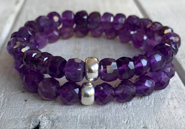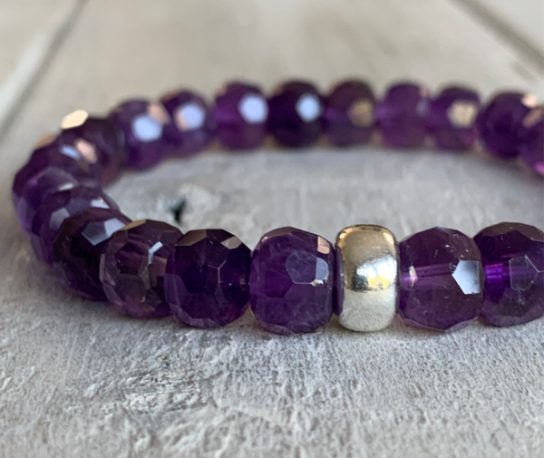 Im funkelnden Amethyst Edelstein Armband VEILCHENVIOLETT sind ca. 8 mm große, facettierte Rondelle (Freiform), veredelt mit einem minimalistischen 925 Sterling Silber Rondell, zu einem beeindruckenden Lieblingsschmuckstück verarbeitet.