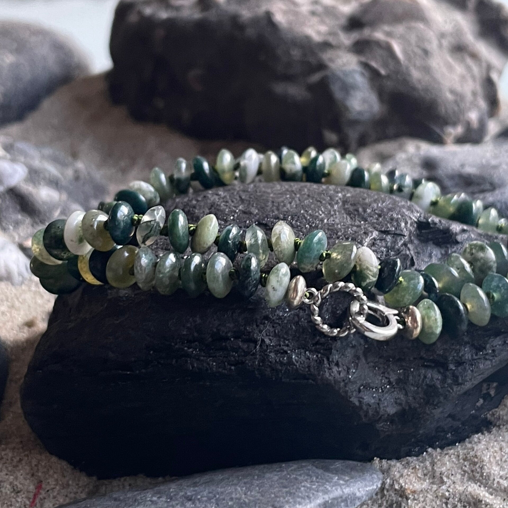 Die handgeknüpfte Achat Edelstein Choker Halskette WALDGEFLÜSTER ist aus zauberhaften Edelsteinrondellen (Freiform) und einem stilvollen 925 Sterling Silber Verschluss gearbeitet. Zwei feine 925 Sterling Silber Rondelle setzen kleine Glanzpunkte und leiten stilvoll vom edlen Verschluss in die Reihe der Edelsteine über.