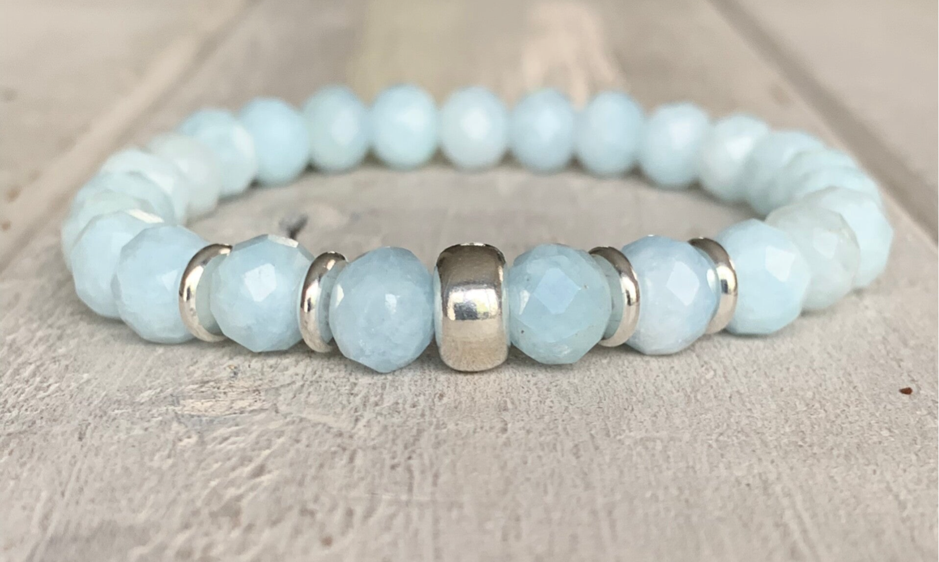Im zauberhaft funkelnden Aquamarin Edelstein Armband OZEANRAUSCHEN sind ca. 8 mm große, facettierte Rondelle (Freiform), veredelt mit einem minimalistischen 925 Sterling Silber Rondell sowie versilberten Heishi Rondellen, zu einem kraftvollen Lieblingsschmuckstück verarbeitet.