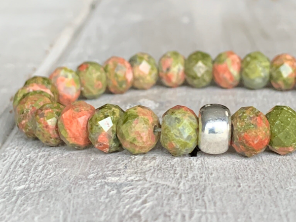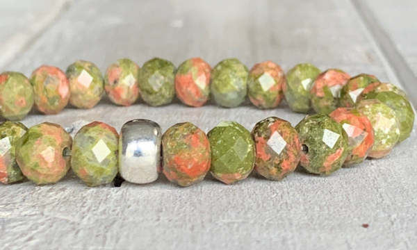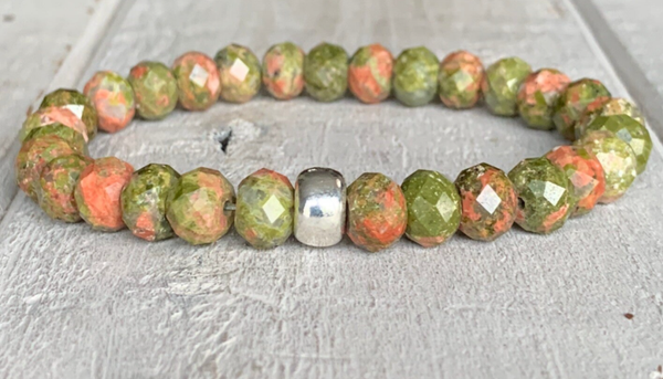 Im zauberhaft funkelnden Unakit Edelstein Armband KIEFERNDUFT sind ca. 8 mm große, facettierte Rondelle (Freiform), veredelt mit einem minimalistischen 925 Sterling Silber Rondell zu einem kraftvollen Lieblingsschmuckstück verarbeitet. Die grün/rosa gemusterten Rondelle schmeicheln mit ihrer für Unakit Edelsteine typischen Farbgebung.