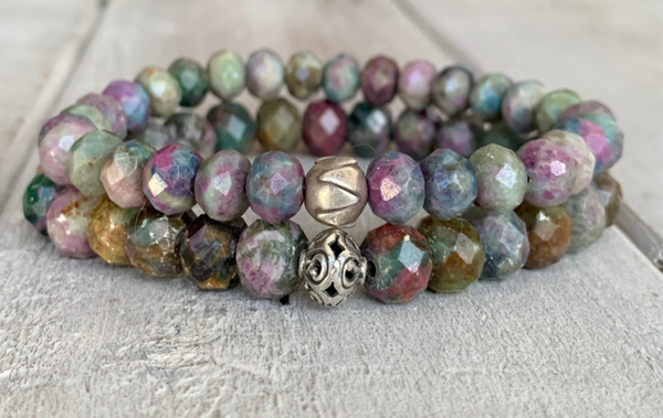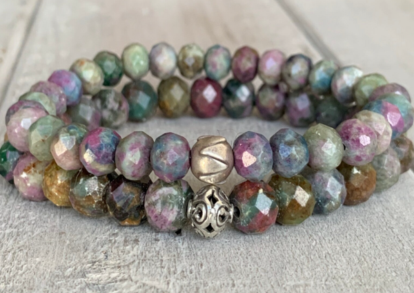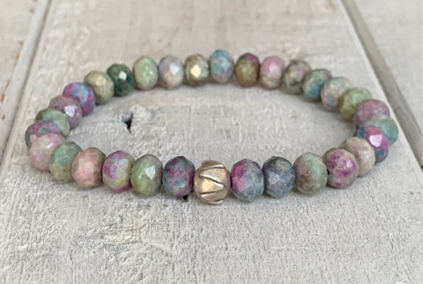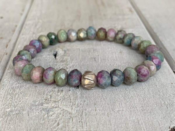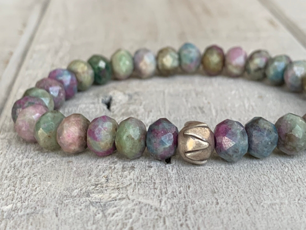 Im zauberhaft funkelnden Rubin in Zoisit Edelstein Armband WUNDERTÜTE sind beeindruckende ca. 8 mm große Rondelle (Freiform) im funkelnden Facettschliff, veredelt mit einer minimalistischen Karen Hill Tribe Feinsilber Lotusperle zu einem kraftvollen Lieblingsschmuckstück verarbeitet.