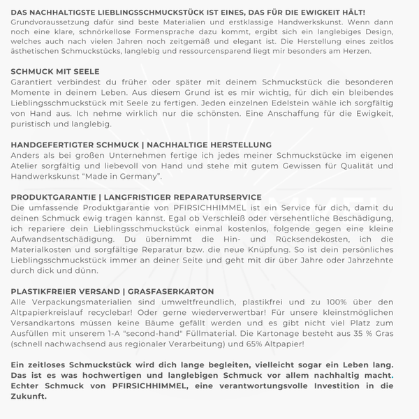 Garantiert verbindest du früher oder später mit deinem Schmuckstück Erlebnisse und Emotionen, daher soll es dich ein Leben lang begleiten. Jeden einzelnen Edelstein wählen wir sorgfältig von Hand aus. Wir nehmen wirklich nur die schönsten. Eine Anschaffung für die Ewigkeit, puristisch, nachhaltig und mit Reparaturservice.