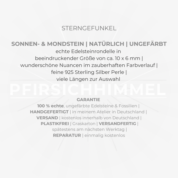 Im atemberaubenden Sonnen- & Mondstein Edelstein Armband STERNGEFUNKEL sind beeindruckende ca. 10 mm große Rondelle, veredelt mit einer charmanten 925 Sterling Silber Perle - die an einen Kreisel erinnert - zu einem eleganten Lieblingsschmuckstück verarbeitet. Dieses feine silberne Element passt wirklich absolut wunderbar zum Stil und den Farben der STERNGEFUNKEL Sonnen- und Mondsteine!