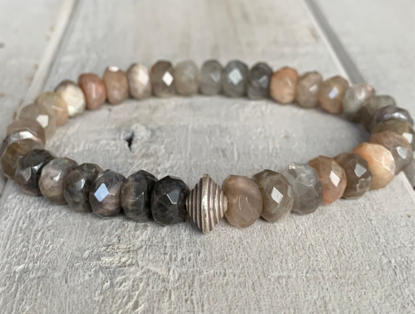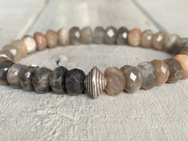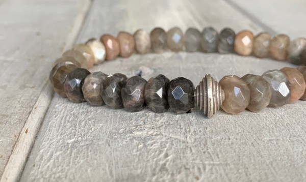 Der Sonnenstein glitzert durch die Einlagerung von mineralischen Plättchen hier ganz dezent und der Mondstein schimmert weißlich, changierend und steht dem Sonnenstein in nichts nach. Die vielseitige Farbigkeit dieser Edelsteine macht dieses Armband zu einem Kombinationswunder.