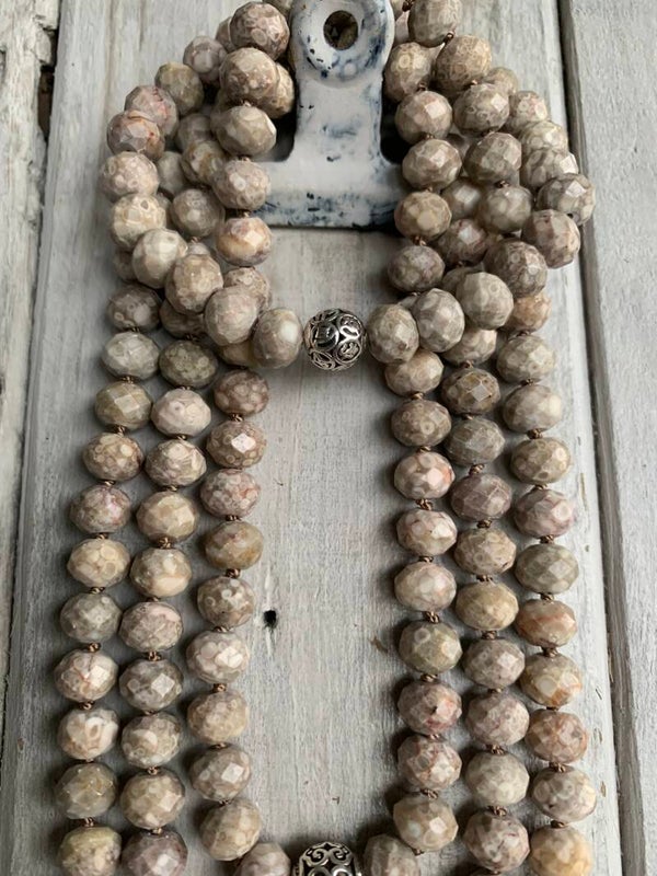 Die atemberaubende handgeknüpfte Fossilien (versteinerte Koralle) Mala Kette WIRBELWIND beeindruckt mit ca. 8 mm großen, facettierten Rondellen. Aufgewertet ist diese bemerkenswerte Fossilien Kette mit einer zauberhaften 925 Sterling Silber Perle mit Ornamenten sowie zwei ganz kleinen Sterling Silber Rondellen.