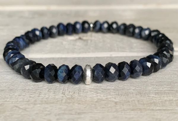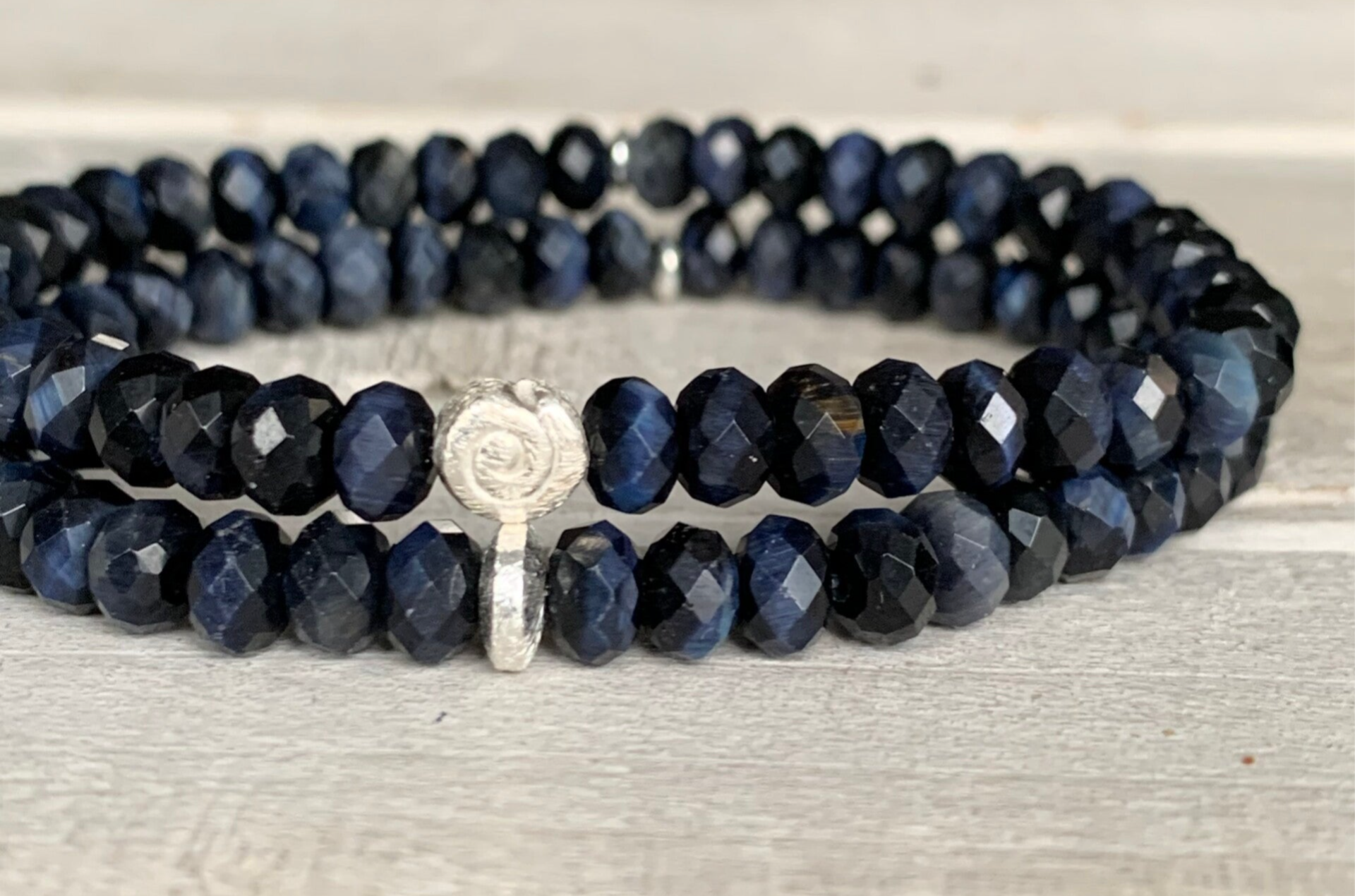Das blaue Tigerauge (Falkenauge) Edelstein Armband NACHTRUHE RONDELL beeindruckt mit blau-schwarz schimmernden Nuancen und funkelt zauberhaft im Licht. Das filigrane Perlenarmband im edlen Bohostyle wird wahlweise durch ein fein strukturiertes 925 Sterling Silber Rondell oder eine Perle in Schneckenform aufgewertet.