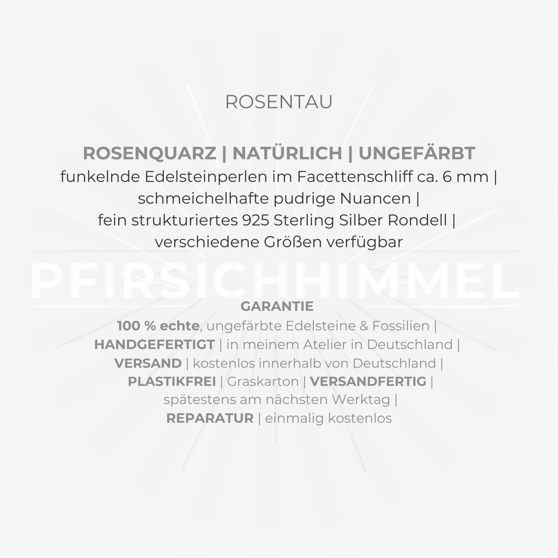 Die Rosenquarzperlen haben ganz pudrig feine Nuancen und die schönen Facetten funkeln besonders edel, sobald sich das Licht in besonderer Weise in ihnen bricht. Das ROSENTAU Edelstein Armband ist ein schmeichelhaftes und zugleich zeitloses Schmuckstückund mit edlem Understatement. Wie immer ist unser echter Schmuckin natura noch viel schöner!